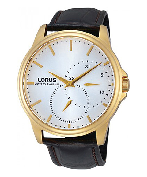 Descrição: Relógio Lorus, analógico, caixa plaqueada, bracelete em pele castanha. Mecanismo quartzo e calendário.